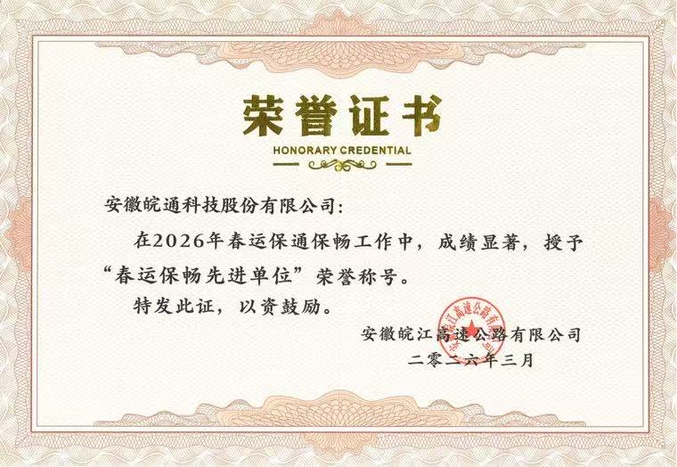 近日,皖通科技在2026年春運(yùn)保通保暢工作中,成績顯著,被安徽皖江高速公路有限公司授予“春運(yùn)保暢先進(jìn)單位”榮譽(yù)稱號。此項(xiàng)榮譽(yù),是對皖通科技在銅商高速銅陵至無為段機(jī)電系統(tǒng)維護(hù)維修(2023-2026年度)項(xiàng)目工作成效的高度認(rèn)可,也彰顯了公司在行業(yè)內(nèi)的專業(yè)技術(shù)能力與優(yōu)質(zhì)服務(wù)水平。